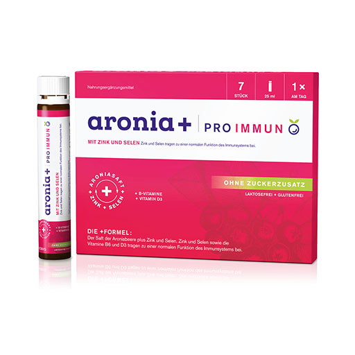aronia+ PRO IMMUN – das Nahrungsergänzungsmittel in Form von Trinkampullen zur Unterstützung des Immunsystems mit der bewährten +Formel aus Aronia, Zink und Selen sowie ausgewählten B-Vitaminen und Vitamin D3. Zink und Selen sowie die Vitamine B6 und D3 tragen zu einer normalen Funktion des Immunsystems bei. Zink und Selen sowie Vitamin B2 tragen zum Schutz der Zellen vor oxidativem Stress bei.