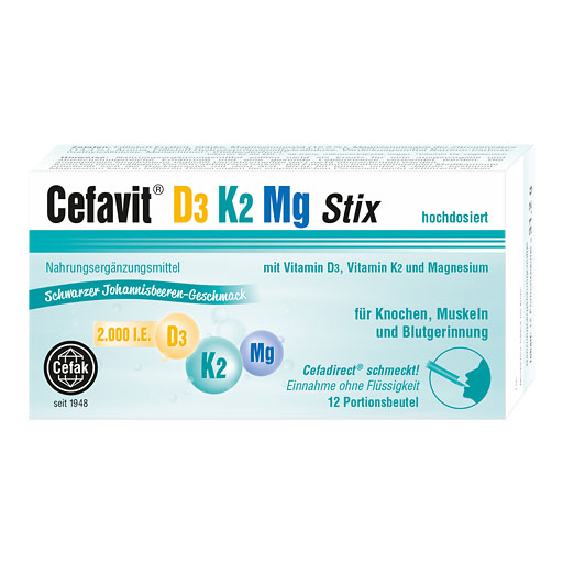 Ein Portionsbeutel liefert hochdosierte Mengen der Vitamine D3 und K2 in sinnvoller Kombination mit zwei Magnesiumverbindungen. In der mikroverkapselten MK-7-Form ist Vitamin K2 sehr gut bioverfügbar und stabil. Cefavit® D3 K2 Mg 2.000 Stix sind für Vegetarier, Kinder (ab 7 Jahre) und Jugendliche geeignet (s. Verzehrempfehlung), schmecken nach schwarzer Johannisbeere und können direkt ohne Flüssigkeit eingenommen werden – Cefadirect® schmeckt!