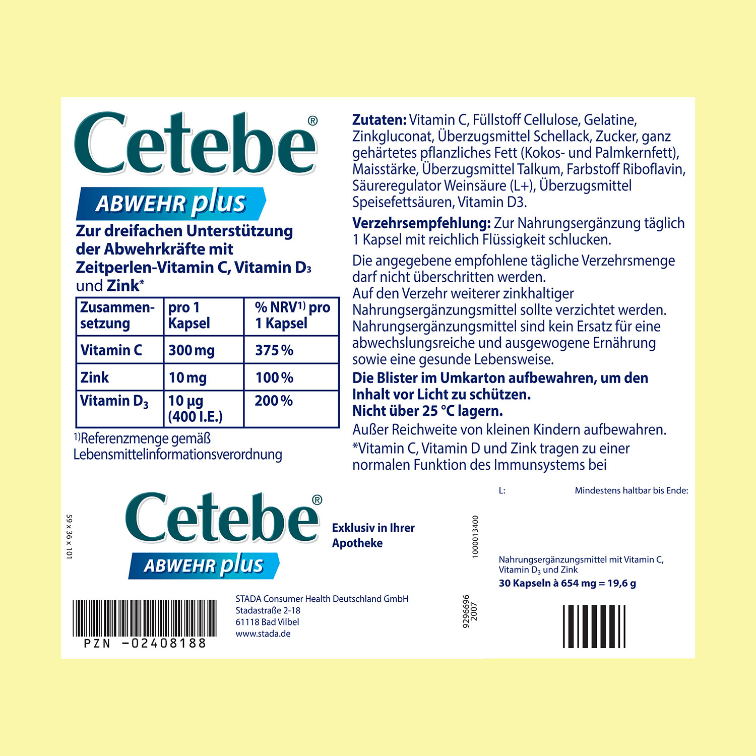Nahrungsergänzungsmittel mit Vitamin C, Zink und Vitamin D3. Cetebe® ABWEHR plus unterstützt mit Hilfe der wichtigen Nährstoffe Vitamin C, Vitamin D und Zink die Abwehrkräfte und trägt zu einer normalen Funktion des Immunsystems bei.** Vitamin C, Vitamin D und Zink sind an unterschiedlichen Prozessen im Immunsystem beteiligt.