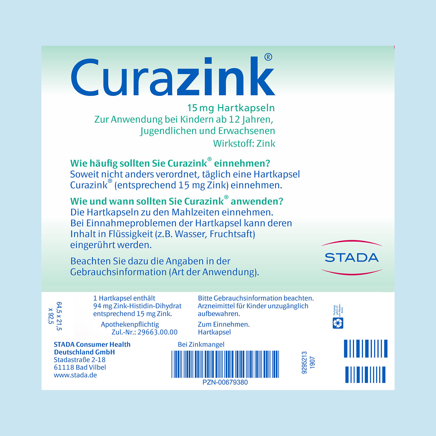Täglich 1 Kapsel Curazink® (entsprechend 15 mg Zink) zu den Mahlzeiten einnehmen. Bei Einnahmeproblemen der Kapsel kann deren Inhalt in Flüssigkeit (z.B. Wasser, Fruchtsäfte) eingerührt werden.