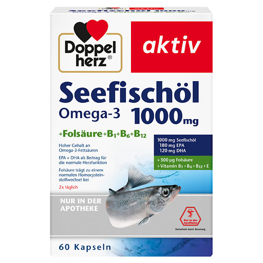 Doppelherz Seefischöl Omega-3 1000 mg+Folsäure+B1+B6+B12 trägt zur Versorgung mit den wichtigen mehrfach ungesättigten Omega-3 Fettsäuren EPA und DHA bei. Mit Folsäure und den Vitaminen B6 und B12 zur Aufrechterhaltung des Homocysteinspiegels und mit Vitamin B1 für die Herzfunktion. Nur 2 Kapseln täglich.
