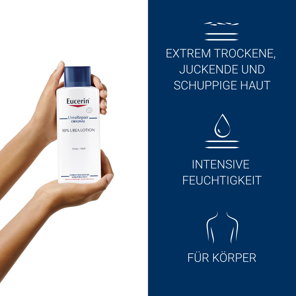 Die besonders reichhaltige Eucerin UreaRepair ORIGINAL Lotion 10% spendet intensiv Feuchtigkeit und beruhigt selbst extrem trockene, juckende und schuppige Haut.