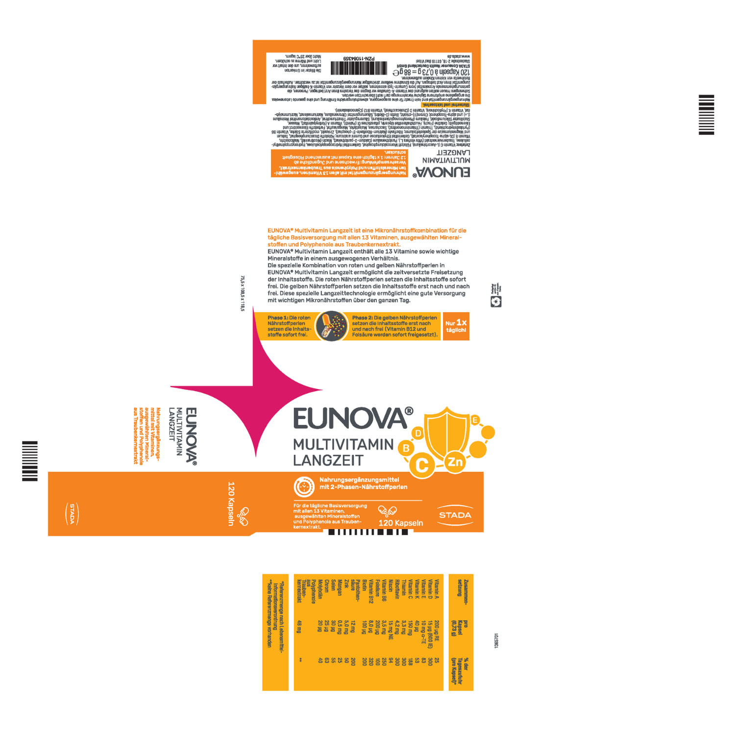 EUNOVA® Langzeit enthält alle Vitamine, wichtige Mineralstoffe und Carotinoide. Durch die einzigartige Langzeit-Technologie werden die wasserlöslichen Vitamine über mehrere Stunden nach und nach freigesetzt. Lediglich bei Vitamin B12 und Folsäure wurde bewusst auf eine zeitverzögerte Freisetzung verzichtet, um eine optimale Aufnahme zu gewährleisten.