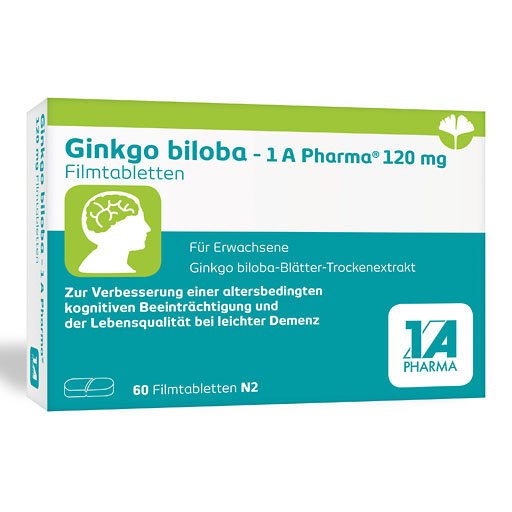 Ginkgo biloba - 1 A Pharma mit einen Trockenextrakt aus Ginkgo biloba-Blättern ist ein pflanzliches Arzneimittel zur Verbesserung einer altersbedingten kognitiven Beeinträchtigung und der Lebensqualität bei leichter Demenz.