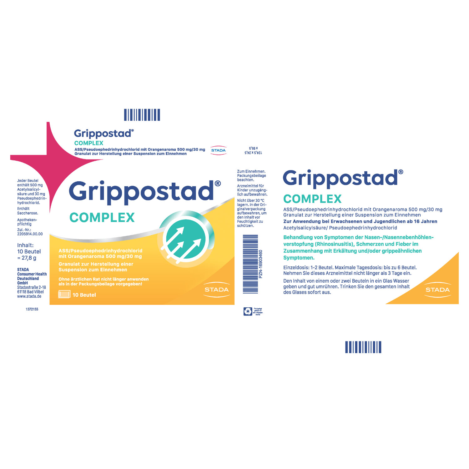 1 Beutel Grippostad® Complex enthält: 500 mg Acetylsalicylsäure (Ph.Eur.) und 30 mg Pseudoephedrinhydrochlorid. Sonstiger Bestandteil mit bekannter Wirkung: 1869 mg Sucrose pro Beutel. Weitere sonstige Bestandteile: Citronensäure, Hypromellose, Orangenaroma.