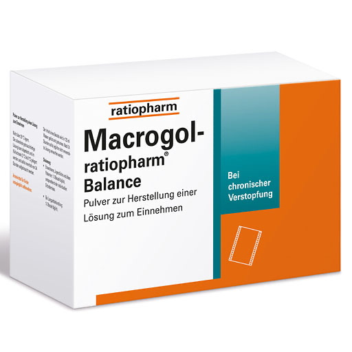 Macrogol-ratiopharm® Balance Pulver zur Herstellung einer Lösung zum Einnehmen Anwendungsgebiete: Chronische Verstopfung. Warnhinweis: Dieses Arzneimittel enthält 0,63 mmol (25 mg) Kalium pro Beutel, 8,1 mmol (187 mg) Natrium pro Beutel und Sorbitol.