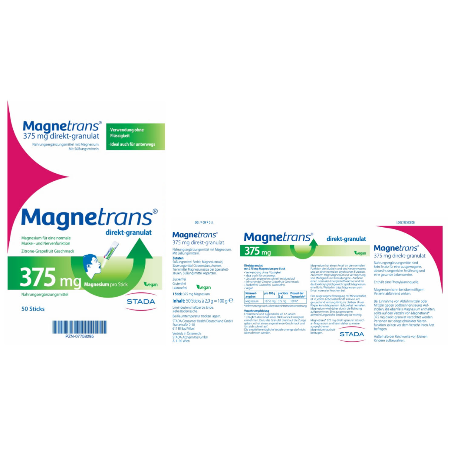 Mit Magnetrans® 375 mg direkt-granulat decken Sie 100% des täglichen Magnesiumbedarfs*in einer Portion. Die Magnesium Sticks sind dabei besonders praktisch für unterwegs. Für die Einnahme brauchen Sie keine Flüssigkeit: Magnetrans® direkt-granulat 375 mg löst sich angenehm leicht im Mund auf und schmeckt frisch nach Zitrone-Grapefruit. Magnetrans® 375 mg direkt-granulat ist vegan, laktose- und glutenfrei. Es enthält das Süßungsmittel Aspartam.